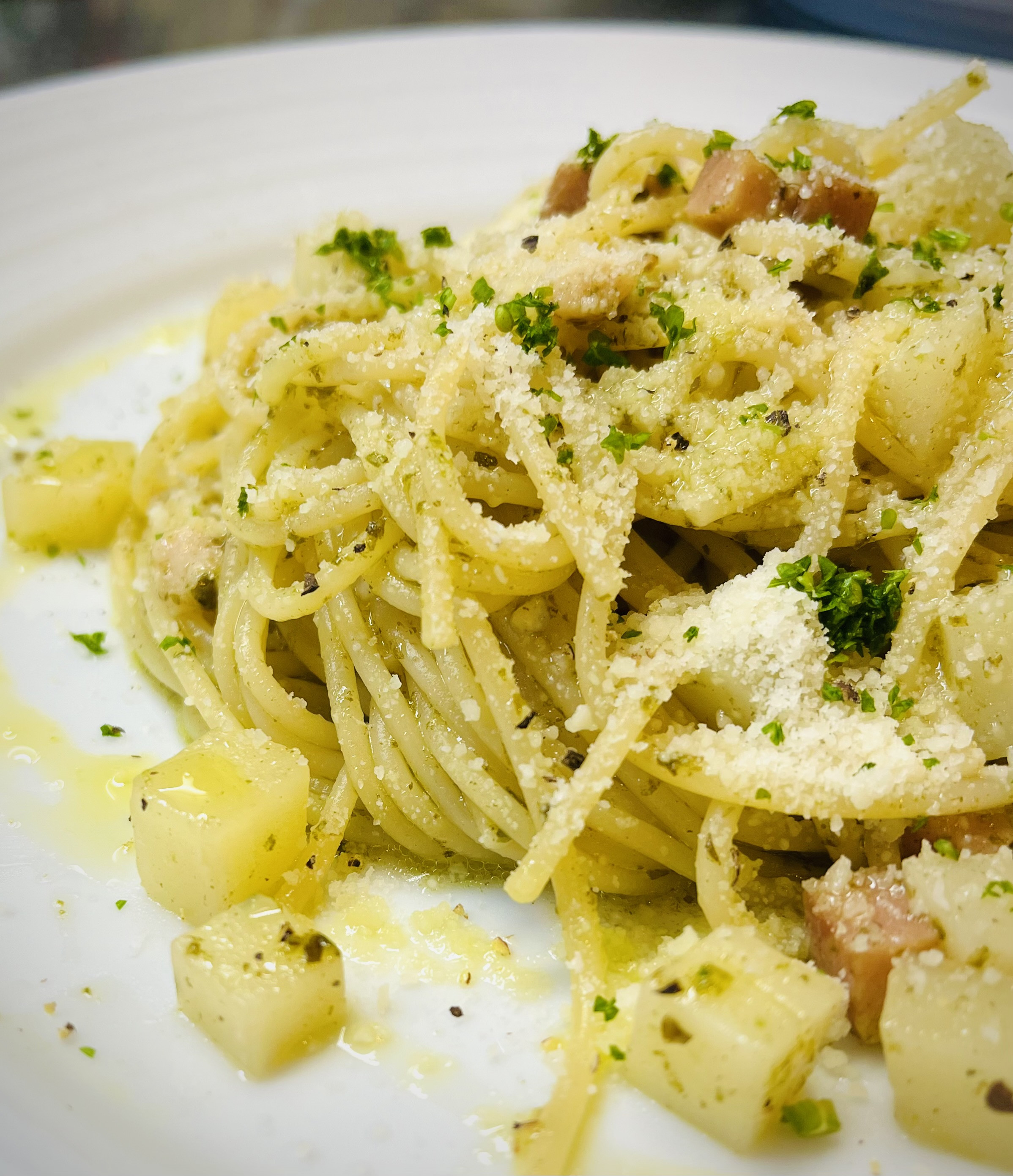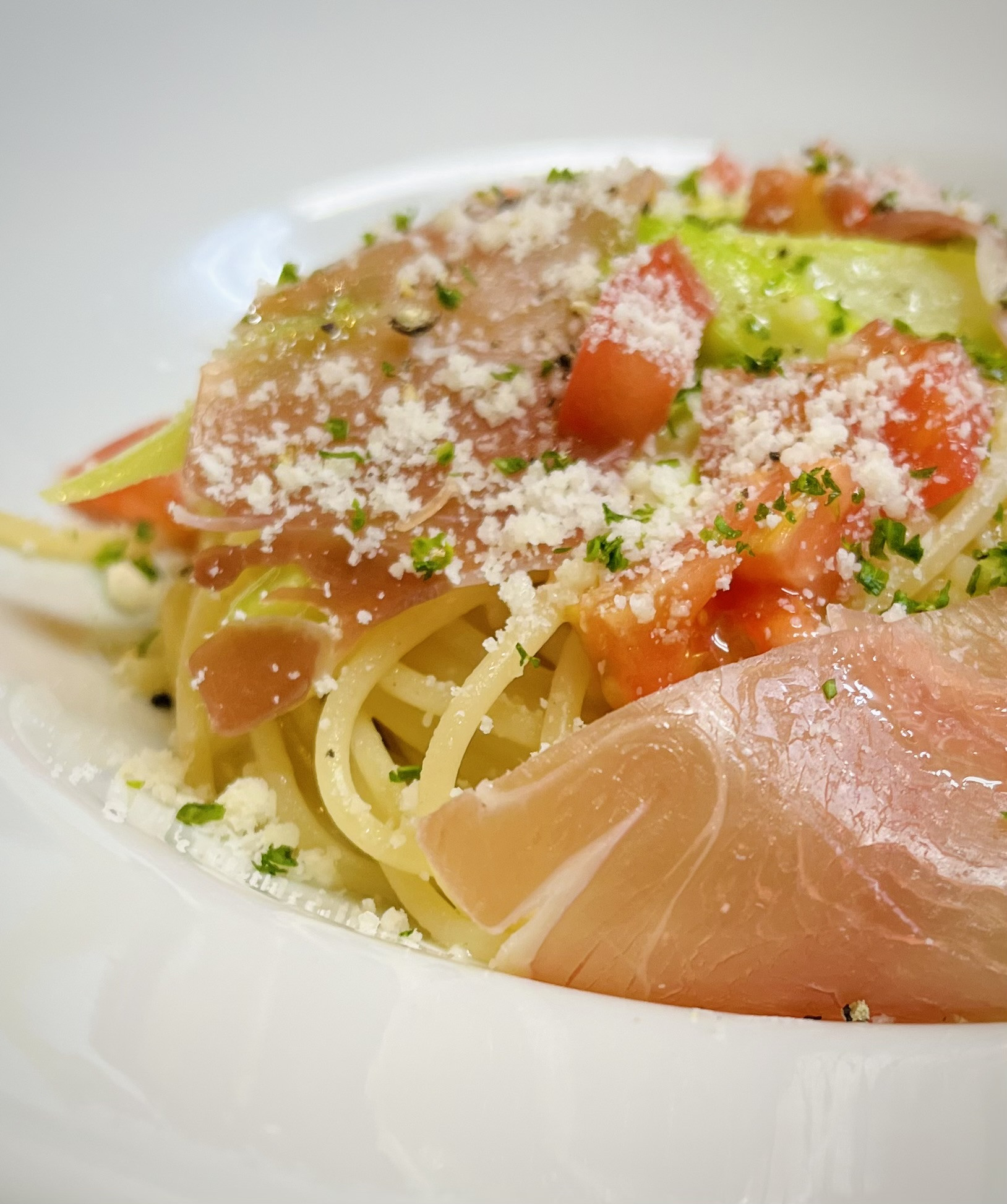 ・生ハムとアスパラとフレッシュトマトのアーリオ・オリオ(+200円)