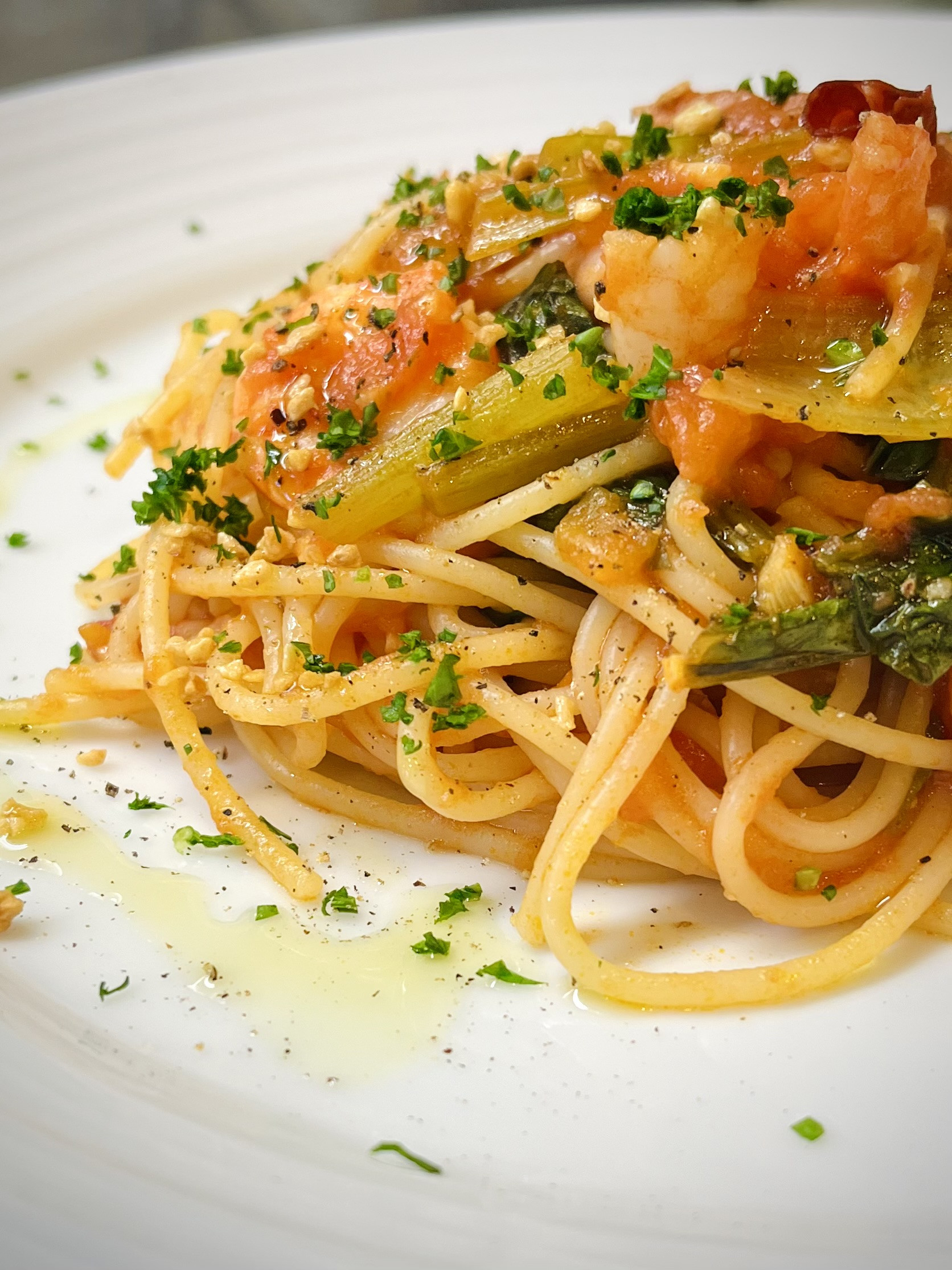 ・エビと小松菜のアラビアータ